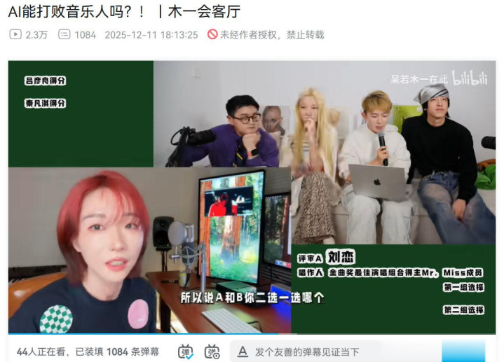 比如B站音乐博主“呆若木一在此”发布了“AI能打败音乐人吗”视频,请来新生代歌手吕彦良、秦凡淇试听AI改编他们的原创曲目,还请来歌手刘恋等音乐人参与对不同版本编曲的盲选,其中几位评委直接将票投给了AI编曲。视频中,曾获台湾金曲奖最佳新人奖提名的吕彦良感慨,AI音乐创作能力超过了99%的人,甚至大部分音乐从业者的水平都不如AI。