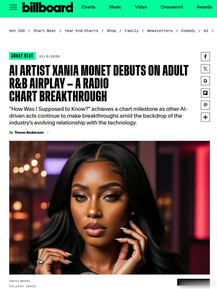 以音乐流媒体平台Spotify为例,SpotifyViral50,即全球飙升榜前50名,在2025年11月内多次出现AI音乐,其中热门的《WalkMyWalk》播放量超过640万。由美国诗人泰莉莎(TelishaNikkiJones)利用AI音乐生成平台Suno创造的虚拟歌手XaniaMonet,在Spotify上拥有超过120万听众,其热门曲目《HowWasISupposedtoKnow?》登上了美国知名音乐榜单Billboard。
